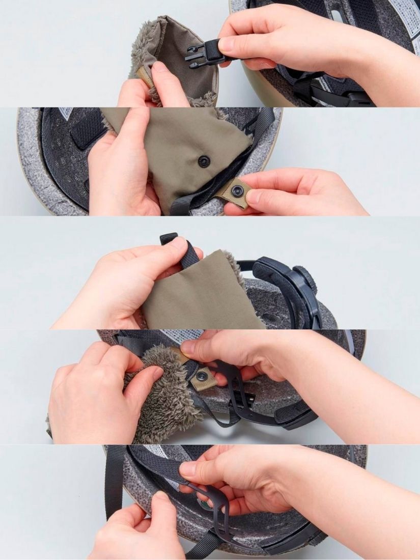 佩戴方法也很簡單。首先,打開按扣,將下巴帶穿過頭盔,注意毛絨布料朝內。