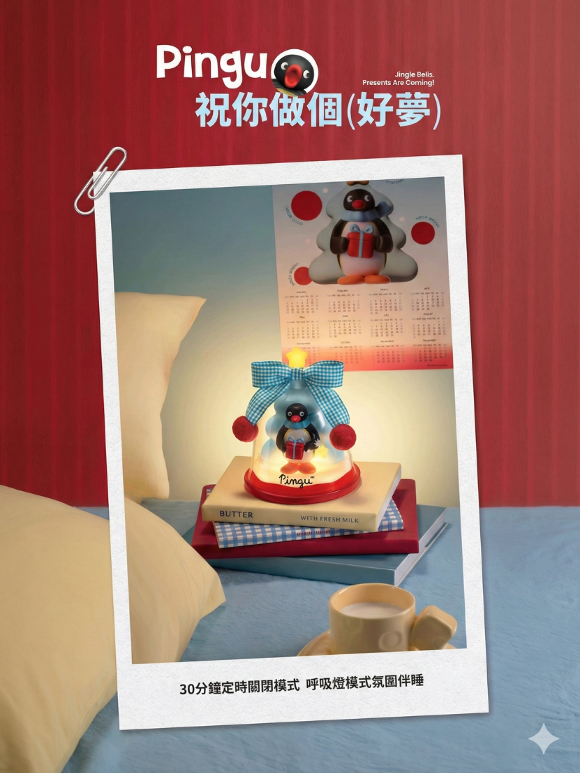 情境:深夜覺得孤單?看著 Pingu 呆萌的臉,暖黃色的燈光灑下來,瞬間覺得心裡暖暖的,壓力全消!