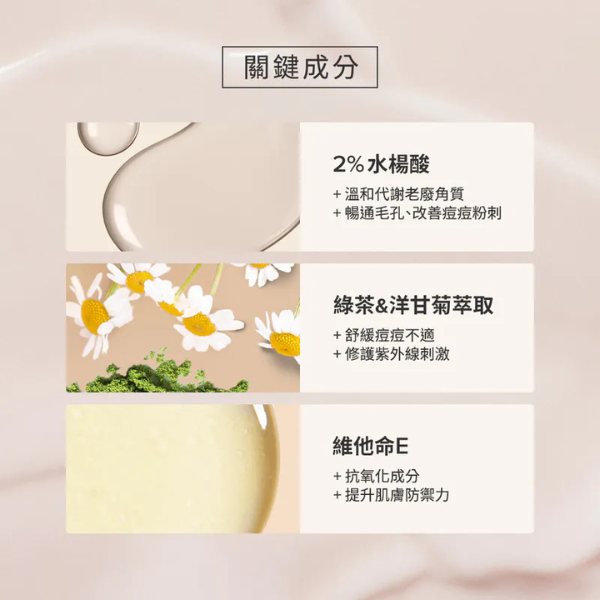 添加最高濃度2%水楊酸,醫師認證可幫助對抗粉刺與痘痘的有效成分,