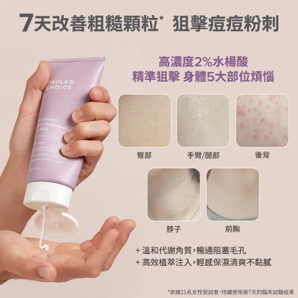 只要使用一次就能明顯感受到2%水楊酸身體乳帶給肌膚的柔嫩細緻。